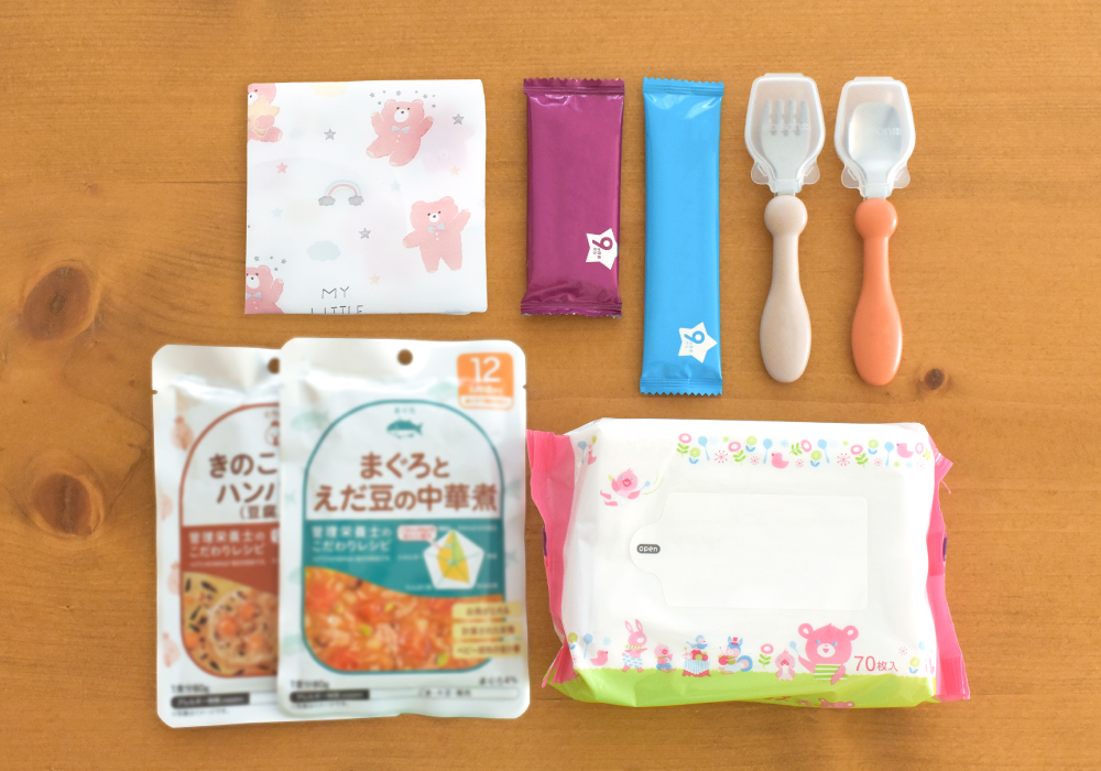 パッケージのまま食べられる離乳食や、使い捨てのスプーンやコップ