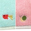 ・タオルハンカチ:ワンポイントの刺繍入り。ピンクの裏はグリーン、ブルーの裏はイエローのリバーシブル仕様。