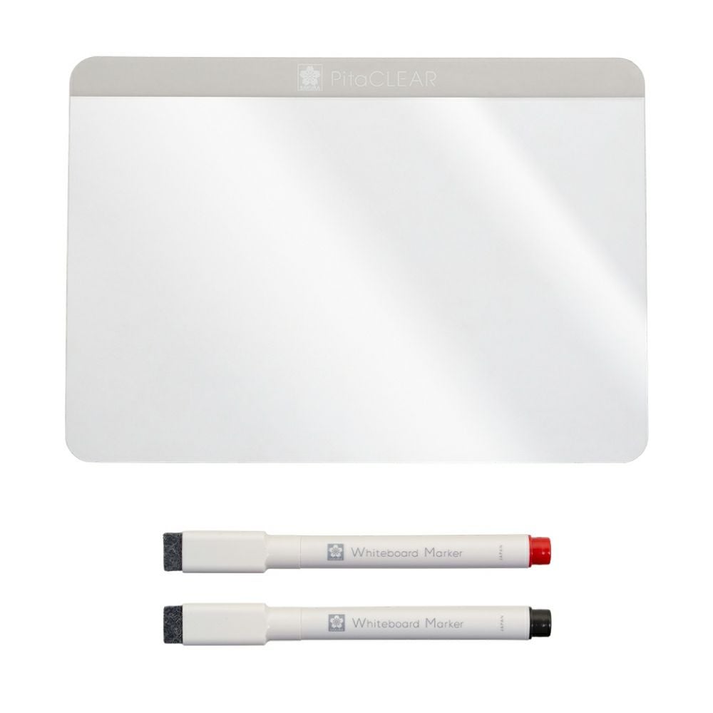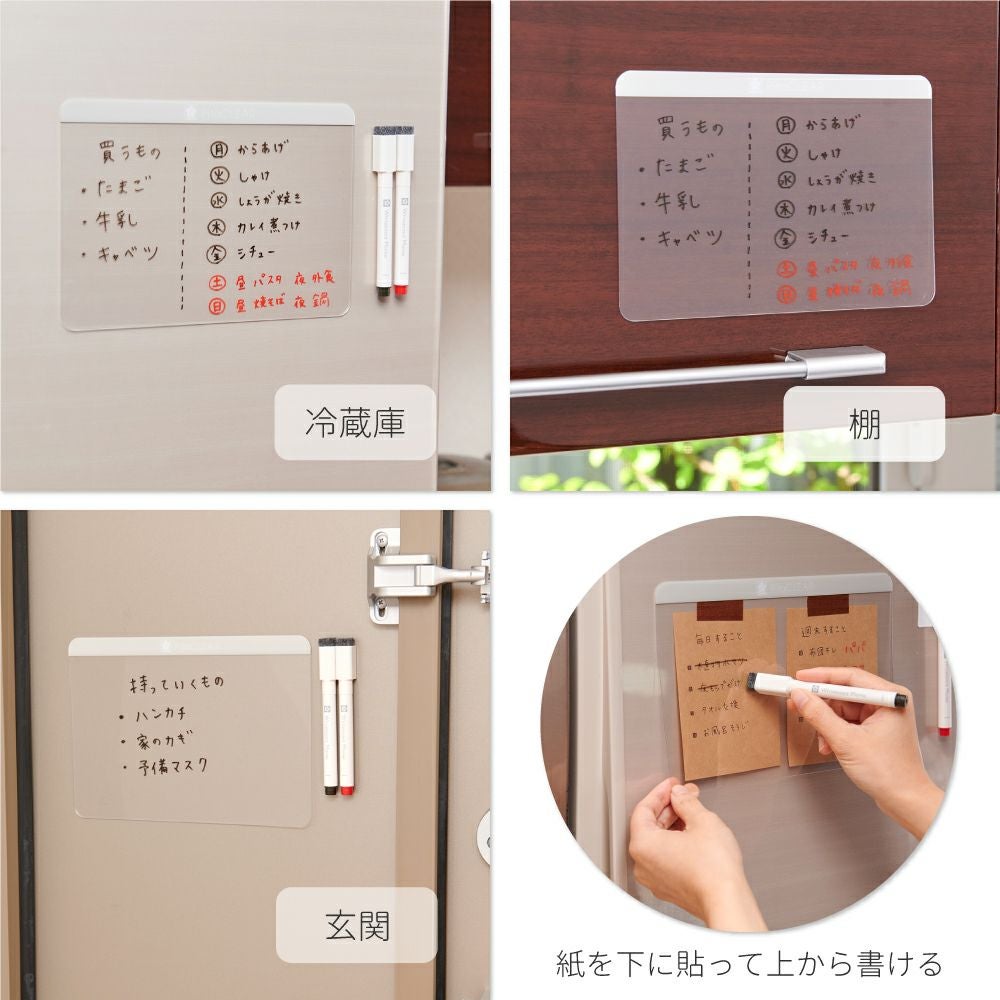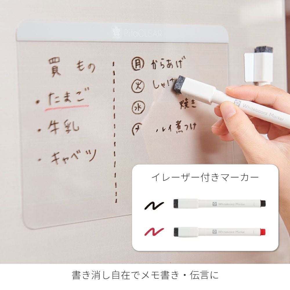 “透明なメモボード”ご家庭の伝言・メモ書きに、色々な場所にピタッと貼れる「ピタクリア」。マグネットの付かない面にも繰り返し貼ってはがせる、便利な粘着シートを使用!透明なので生活空間になじみ、視界を遮らず洗面台の鏡やガラスなどにも使えます。イレーザー付きホワイトボードマーカーで書き消しできる、A5サイズのメモボードです。
