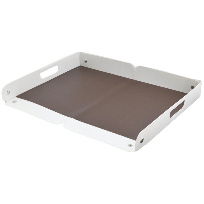 フチを立てて四隅をスナップボタンで留めると簡単にトレーが完成。スナップボタンは大きくて扱いやすく、準備から片づけまでお子さま一人で行うことができます。絵や文字をかくときは手前のスナップを固定せずに、工作をするときは全てのスナップを止めると作業しやすくなります。組み立時はA3サイズまで置けるので、のびのびと使用できます。使い終わった後は使用した面を折りたたんでスナップで留め、スリムに収納できます。