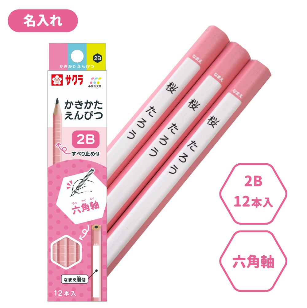かきかた鉛筆 六角軸滑り止め付2B ピンク 名入れ