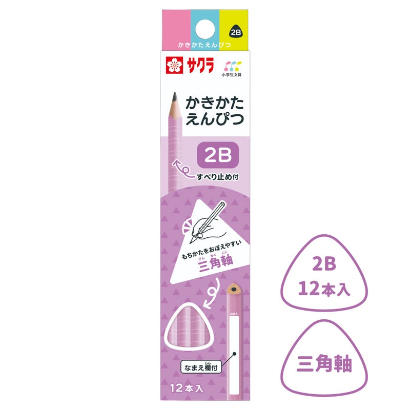 【初めて使う鉛筆に!】サクラクレパスの「かきかた鉛筆」は、お子様の使いやすさ、保護者の安心感、教える先生の3方向目線から開発されました。持ち方を覚えやすい『三角軸』と、転がりにくい『六角軸』の2ラインナップをご用意しています。カラーバリエーションは4色で、シンプルなデザインなので気が散らずに学習に集中できます。表面に滑り止め加工をしているので高い筆圧や汗に強く、初めての鉛筆にぴったりです。