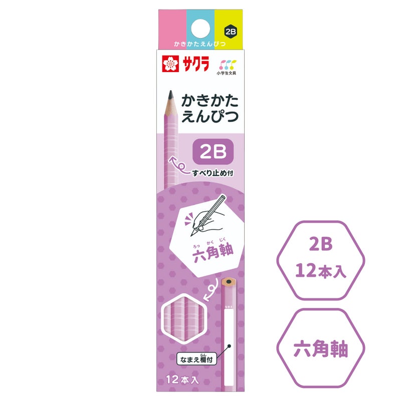 【初めて使う鉛筆に!】サクラクレパスの「かきかた鉛筆」は、お子様の使いやすさ、保護者の安心感、教える先生の3方向目線から開発されました。持ち方を覚えやすい『三角軸』と、転がりにくい『六角軸』の2ラインナップをご用意しています。カラーバリエーションは4色で、シンプルなデザインなので気が散らずに学習に集中できます。表面に滑り止め加工をしているので高い筆圧や汗に強く、初めての鉛筆にぴったりです。