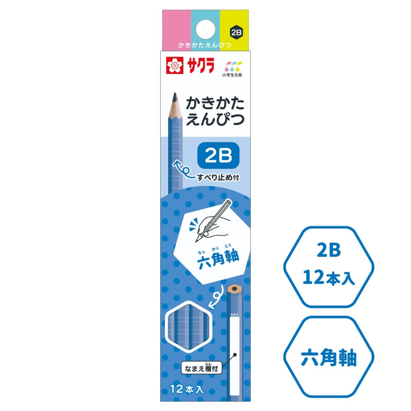 【初めて使う鉛筆に!】サクラクレパスの「かきかた鉛筆」は、お子様の使いやすさ、保護者の安心感、教える先生の3方向目線から開発されました。持ち方を覚えやすい『三角軸』と、転がりにくい『六角軸』の2ラインナップをご用意しています。カラーバリエーションは4色で、シンプルなデザインなので気が散らずに学習に集中できます。表面に滑り止め加工をしているので高い筆圧や汗に強く、初めての鉛筆にぴったりです。