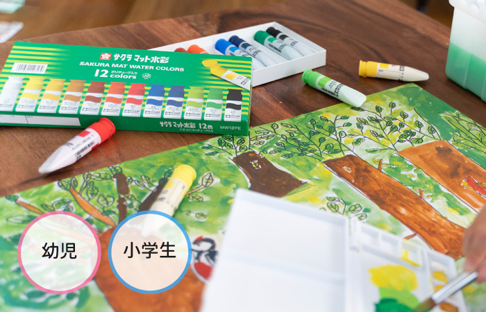 学童用に開発された水彩絵の具。水の量を調整すれば、透明調から不透明調まで自在に表現!